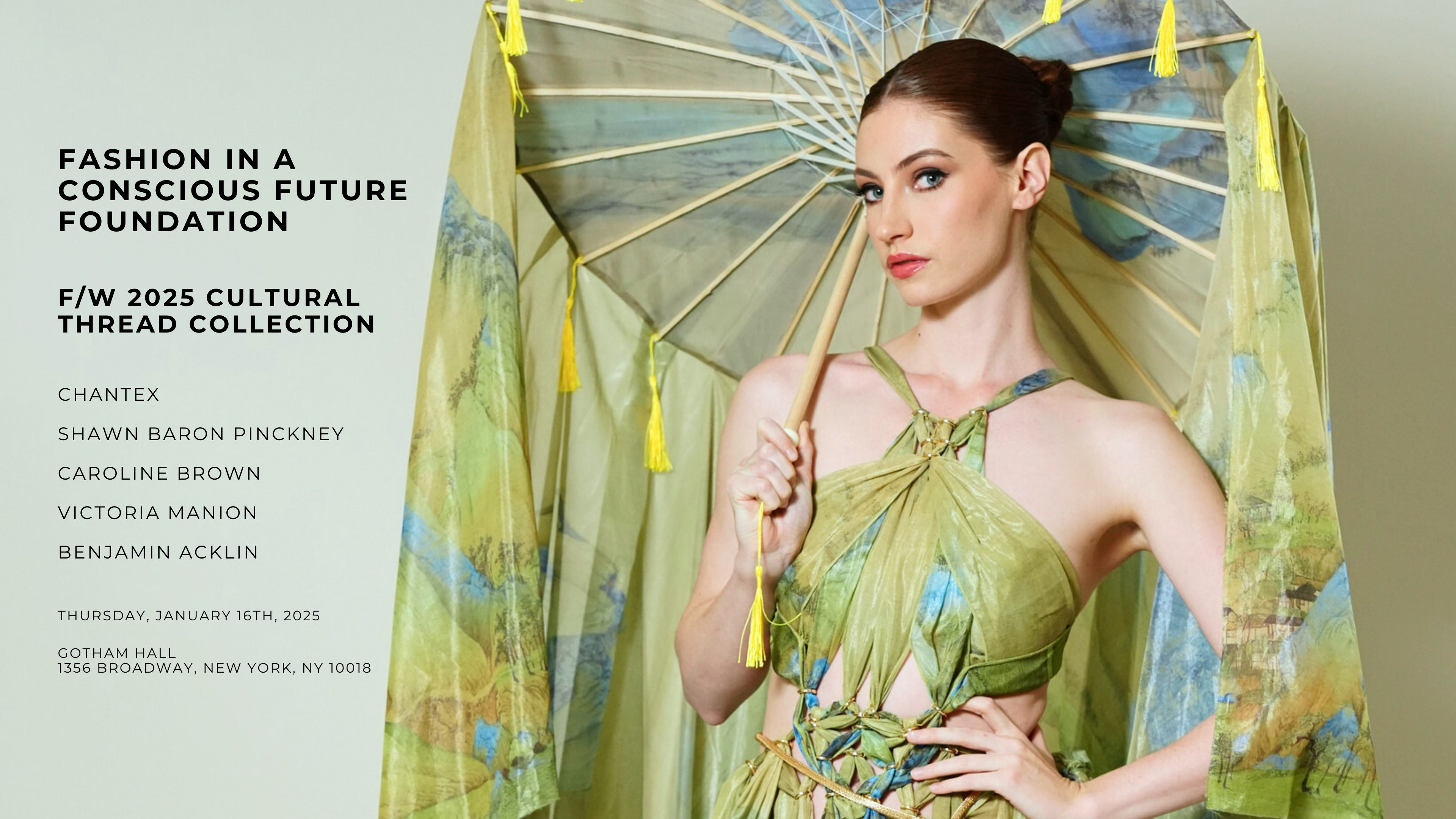 New York, January 16, 2025 – The Fashion in a Conscious Future Foundation (FICFF) brought together sustainability and cultural heritage for their F/W25 Cultural Thread Collection runway show at Gotham Hall, New York City. As part of FICFF’s Green Thread Sustainable Innovation Program, the event showcased the foundation’s commitment to supporting member designers and advancing sustainability in the fashion industry.