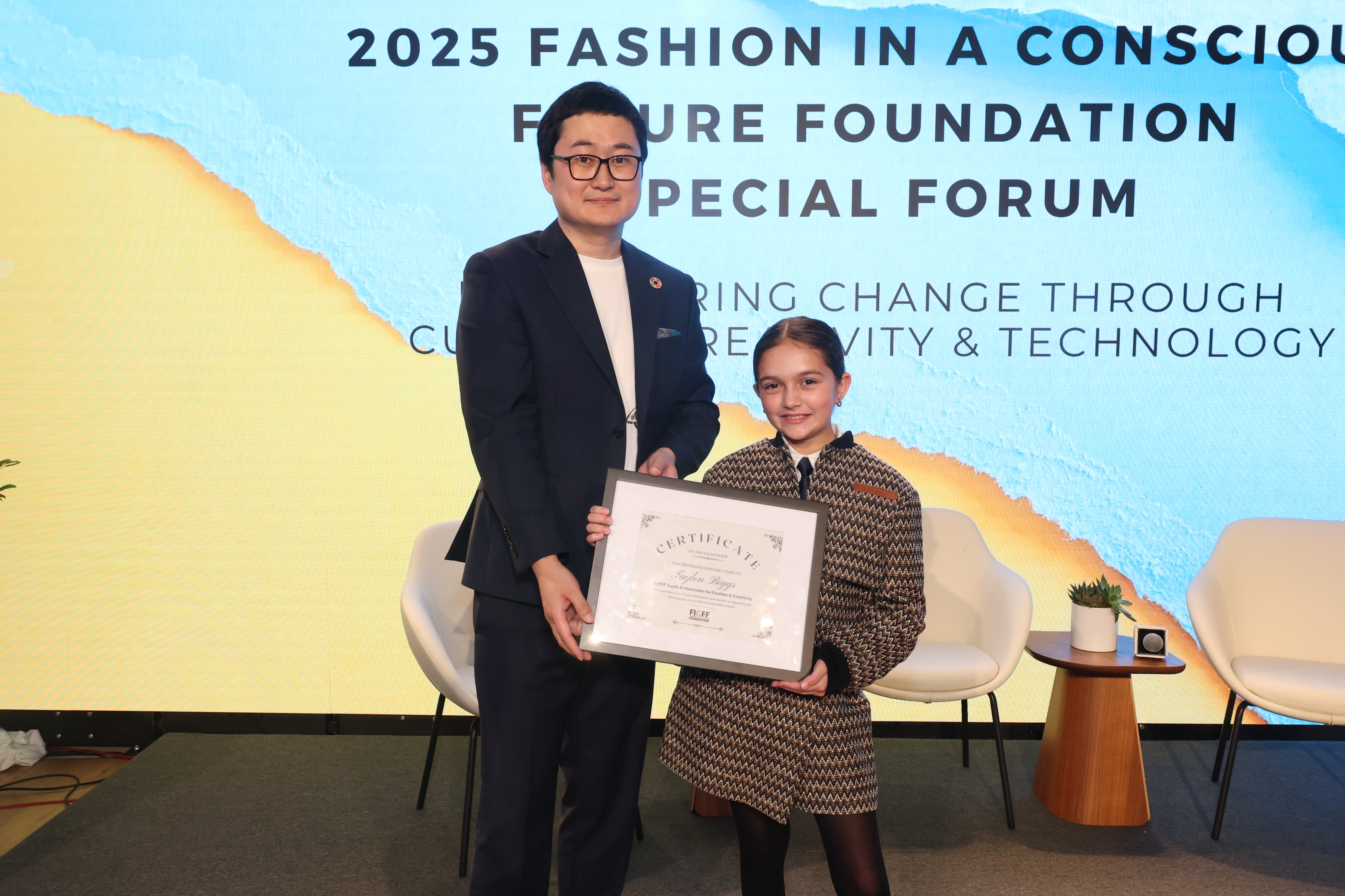 At the forum, Yitong Qin formally presented Taylen Biggs with a certificate appointing her as FICFF Youth Ambassador for Fashion and Creativity, recognizing her talent and influence as a rising voice in the global creative industries.