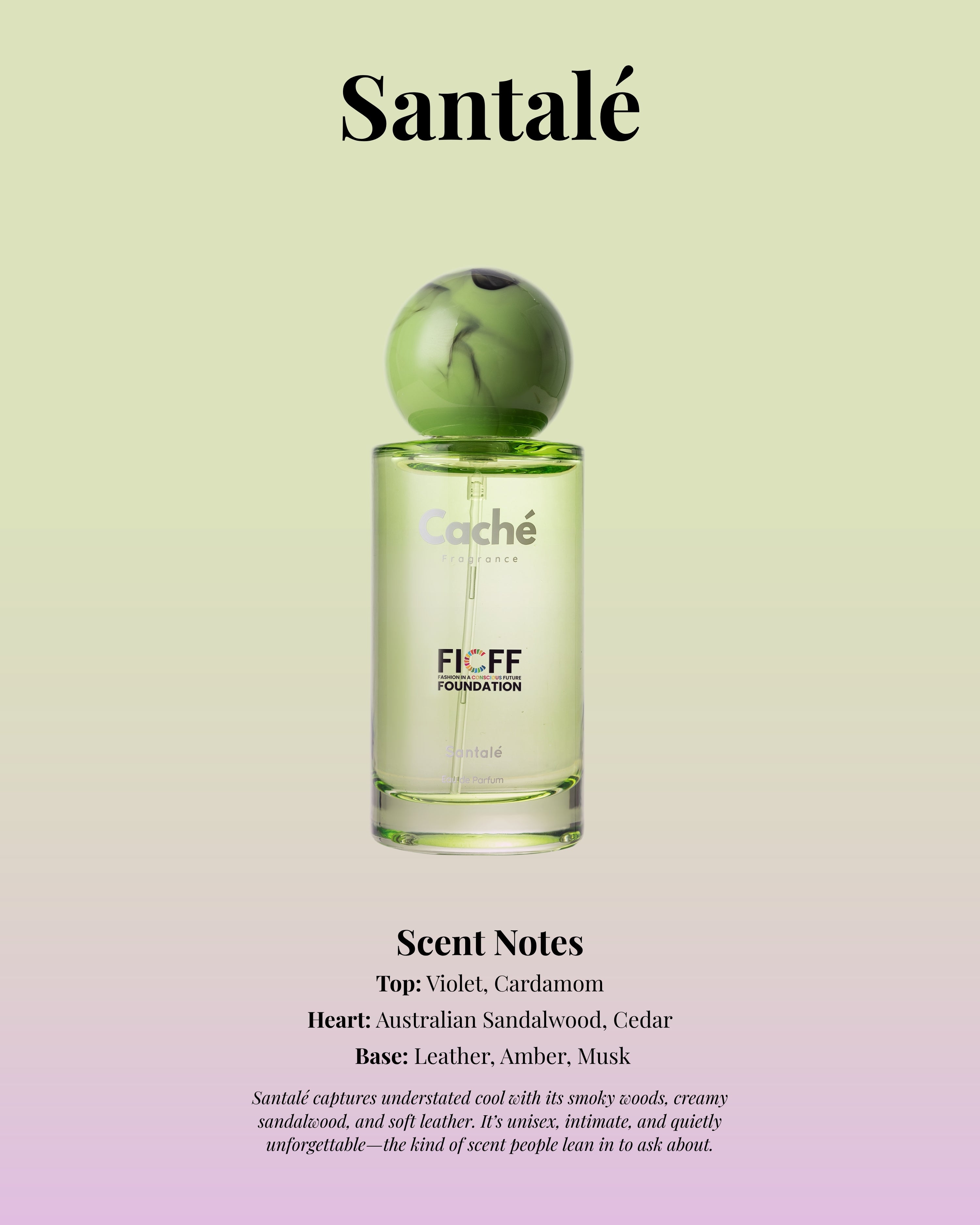 With Caché x FICFF – Santalé, the Fashion in a Conscious Future Foundation (FICFF) continues its mission of weaving sustainability and cultural values into modern lifestyle. Inspired by the grounding strength of sandalwood, this fragrance reflects FICFF’s belief in building a foundation of calm, resilience, and timeless beauty—values that extend beyond fashion into the way we live and connect with the world.